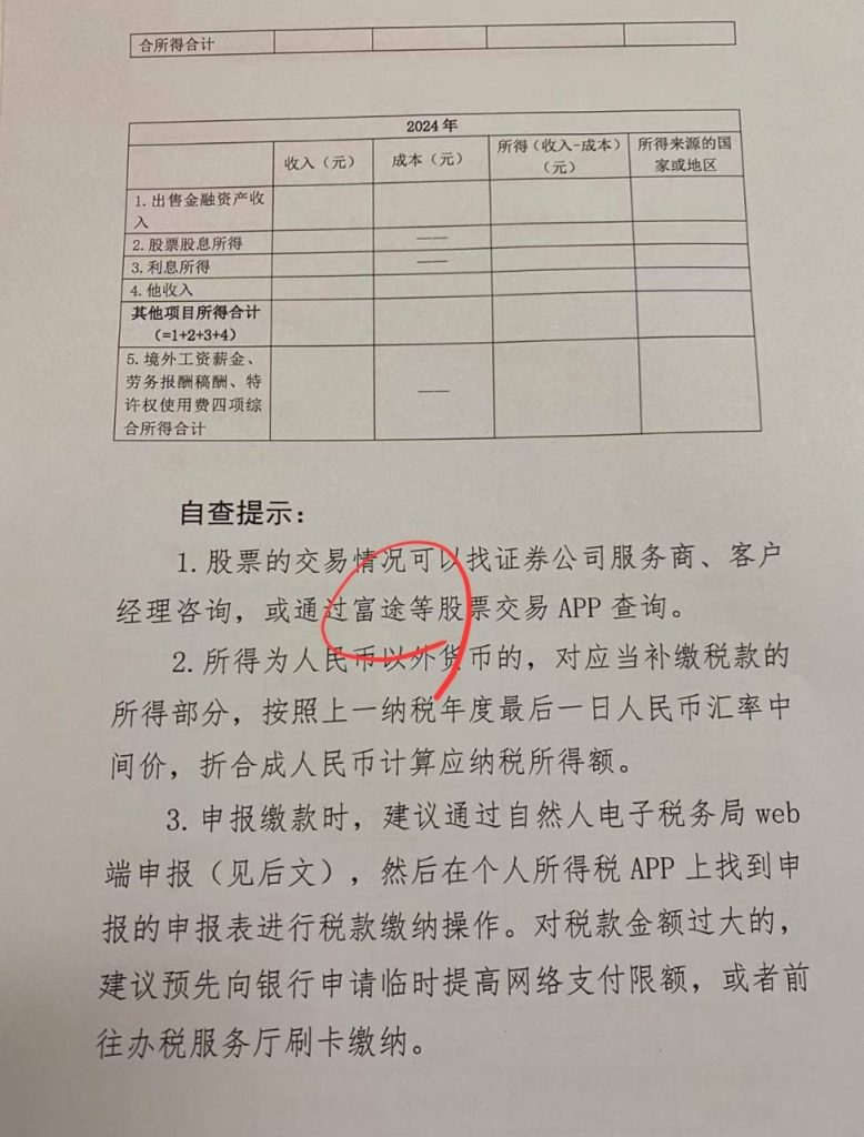 特别标注了可以通过富途等股票交易 App 查询股票交易情况 看来税务方面对中资券商非常熟悉。