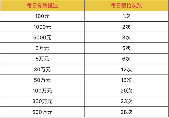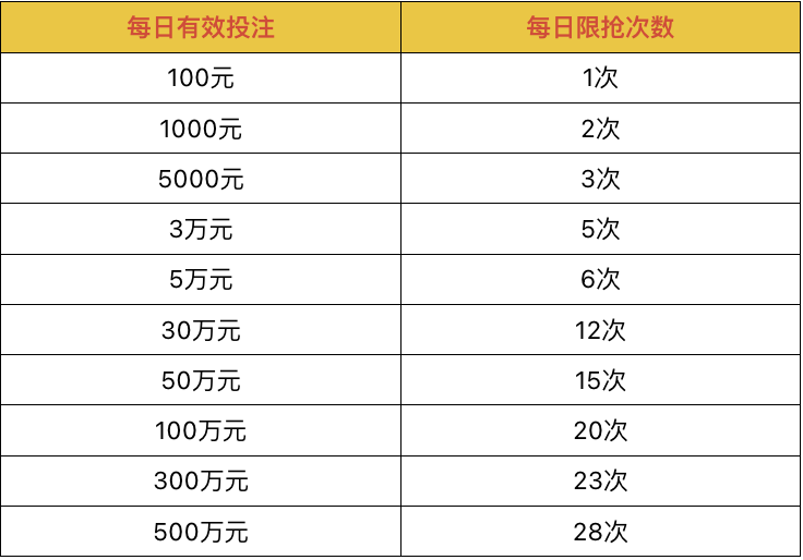 2、会员账号充值50元起,打码200元起,当日可最多抢10次红包;