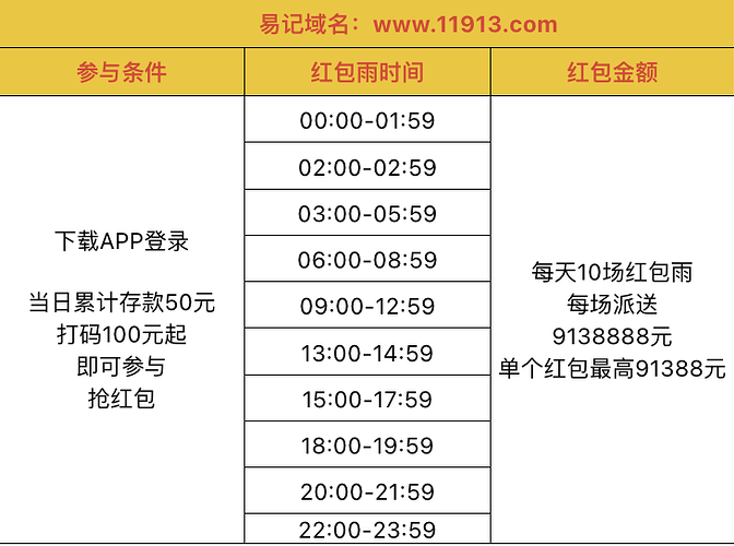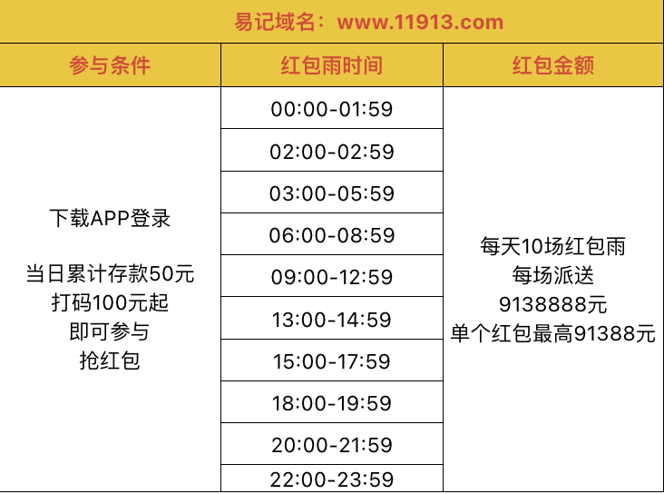 天天红包雨 每日10场,单个红包最高91388元 幸运红包可获得10倍嘉奖!